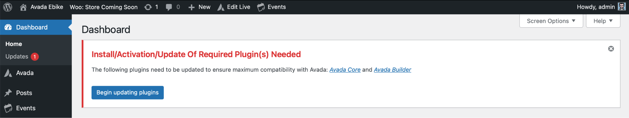If the required Avada Core and Avada Builder plugins are inactive or not running the latest available versions, you will see a notice at the top of your WordPress Dashboard. If you dismiss or do not see the prompt, navigate to WordPress Dashboard > Avada > Plugins and activate/update the plugins as needed.
