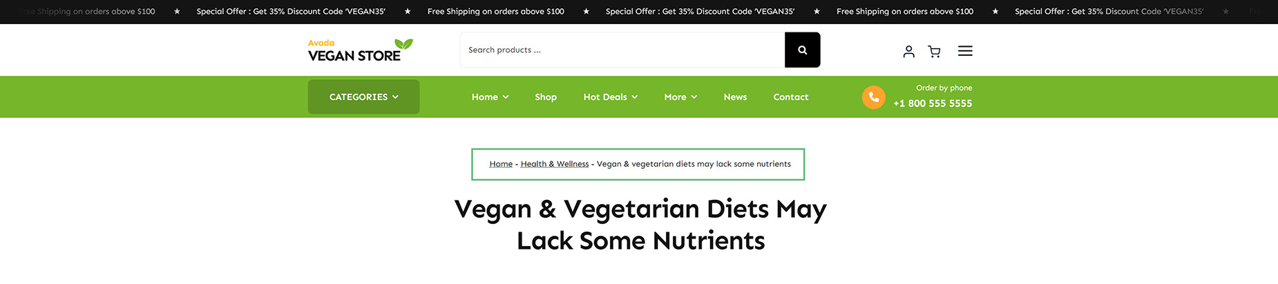 Breadcrumbs are not typically placed directly on a single page, though it is possible to do so, but rather in a Layout Section, such as a Page Title Bar Layout Section. This allows the Breadcrumbs Element to be added once, and it is then displayed on all pages, posts etc that are using that layout section. The most common places you will see breadcrumbs are in WooCommerce products and in blog posts. In the image below, you can see the breadcrumbs in a page title bar layout section at the top of a blog post on the Avada Vegan Store prebuilt.
