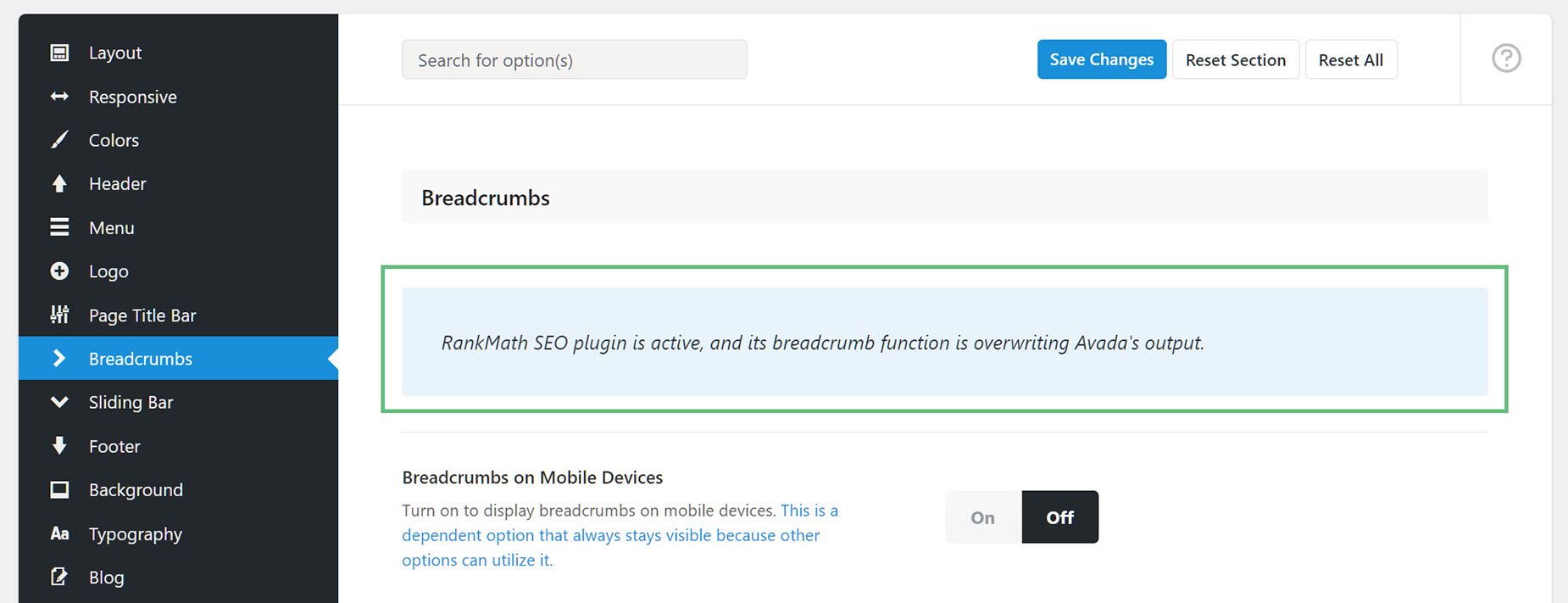 One thing to note about Avada Breadcrumbs is around plugin conflicts. If you have the Yoast or Rank Math SEO plugin activated you will see a message at the top of the Element and in the Global Options that lets you know that a plugin is active and that their breadcrumb function is overwriting Avada’s output. So if you want to use Avada Breadcrumbs, and still want to use an SEO plugin, ensure you have turned the Breadcrumbs feature off in the plugin.