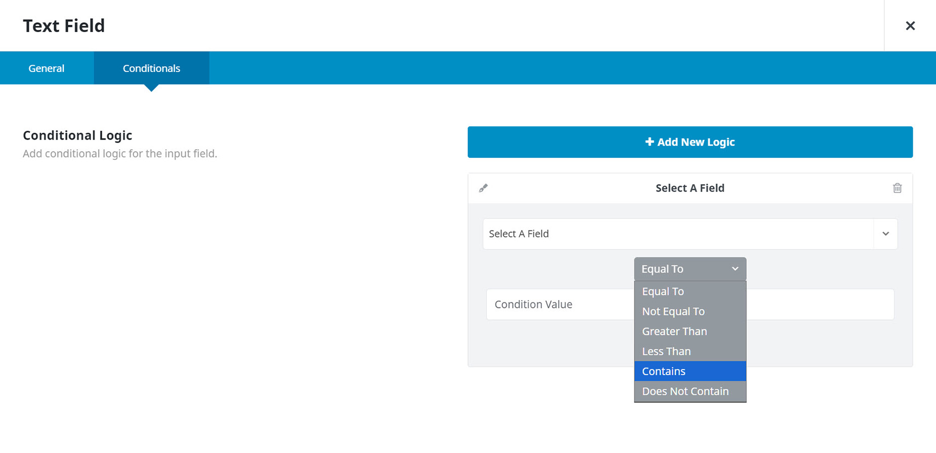 You will find Conditional Logic under the Conditionals Tab on almost all Form Builder Elements, with the exception of the Hidden Field, Honeypot Field, reCAPTCHA Field, and Turnstile Field Elements. As you can see in the screenshot below, when you click on the + Add New Logic button, you are presented with a Conditional Statement dialog, that has a Field option, a Relational Operator selector (Equal To, Not Equal To, Greater Than, Less Than, Contains and Does Not Contain), and a Value field beneath this. Under the Conditional Statement is an AND/OR connective, which you can use to combine further Conditional Statements.