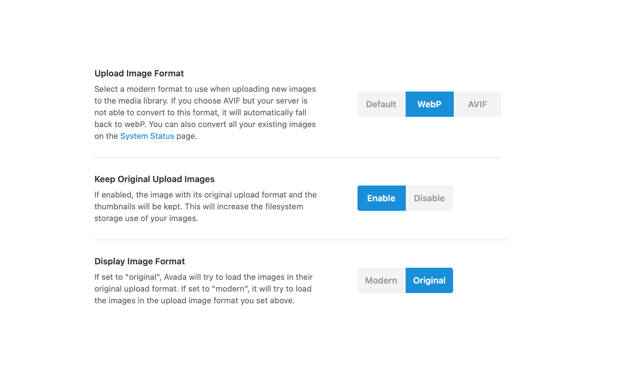 If you have converted your media library images and enabled the “Keep Original Upload Images” option, a final option appears: “Display Image Format”. With this option, it’s set to Modern by default, but if you set it to Original, Avada will try to load images in their original format. So, this option basically lets you revert to the original set of images after they have been converted.